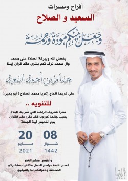 احتفلت عائلة السعيد والصلاح في صفوى مساء يوم الخميس بعقد قران الشاب حسام أحمد السعيد على كريمة الحاج زكريا محمد الصلاح«أبو يحيى» وسط فرحة الأهل والأصدقاء ومحبي العريسين. أسرة ”جهينة الإخبارية“ تهنئ العريسين وعائلتيهما وتسأل الله ان يبارك لهما، متمنين لهما حياة سعيدة. ‏ ...