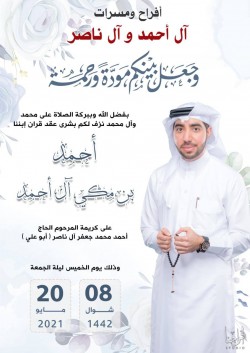 احتفلت عائلة آل أحمد وآل ناصر في صفوى مساء يوم الخميس بعقد قران الشاب أحمد مكي آل أحمد على كريمة الحاج أحمد محمد جعفر آل ناصر «أبو علي» وسط فرحة الأهل والأصدقاء ومحبي العريسين. أسرة ”جهينة الإخبارية“ تهنئ العريسين وعائلتيهما وتسأل الله ان يبارك لهما، متمنين لهما حياة سعيدة. ‏ ...