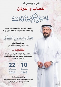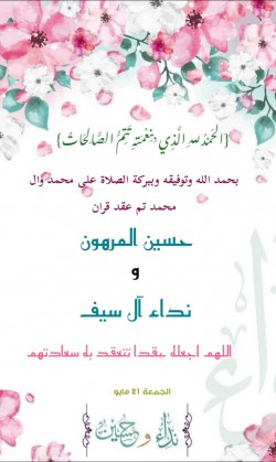 احتفلت عائلة القصاب والفردان في صفوى مساء يوم السبت بعقد قران الشاب محمد حسين القصاب على كريمة الحاج حسين مهدي الفردان «أبو علي» وسط فرحة الأهل والأصدقاء ومحبي العريسين. أسرة ”جهينة الإخبارية“ تهنئ العريسين وعائلتيهما وتسأل الله ان يبارك لهما، متمنين لهما حياة سعيدة. ‏ ...