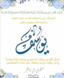 رُزق الشاب سلمان آل زاهر بمولود اتفق وحرمه على تسميته «يوسف». أسرة ”جهينة الإخبارية“ تبارك له على المولود جعله الله من مواليد السعادة واقر الله به عين والديه. ‏ ...