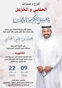 احتفلت عائلة الحنابي والخزعل في صفوى مساء يوم الإثنين بعقد قران الشاب محمد علي الحنابي على كريمة الحاج عبدالله حسن الخزعل «أبو سمير» وسط فرحة الأهل والأصدقاء ومحبي العريسين. أسرة ”جهينة الإخبارية“ تهنئ العريسين وعائلتيهما وتسأل الله ان يبارك لهما، متمنين لهما حياة سعيدة. ‏ ...