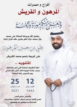 احتفلت عائلة المرهون والقريش في صفوى مساء يوم الخميس بعقد قران الشاب علي حسين المرهون على كريمة الحاج باسم محمد القريش وسط فرحة الأهل والأصدقاء ومحبي العريسين. أسرة ”جهينة الإخبارية“ تهنئ العريسين وعائلتيهما وتسأل الله ان يبارك لهما، متمنين لهما حياة سعيدة. ‏ ...