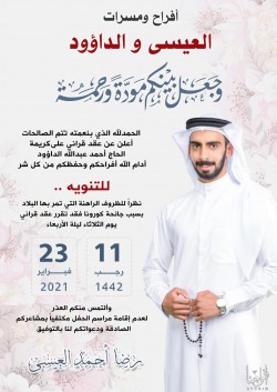 احتفلت عائلة العيسى والداؤود في صفوى مساء يوم الثلاثاء بعقد قران الشاب رضا أحمد العيسى على كريمة الحاج أحمد عبدالله الداؤود وسط فرحة الأهل والأصدقاء ومحبي العريسين. أسرة ”جهينة الإخبارية“ تهنئ العريسين وعائلتيهما وتسأل الله ان يبارك لهما، متمنين لهما حياة سعيدة. ‏ ...