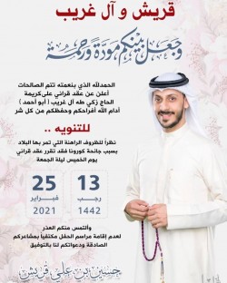 تحتفل عائلة قريش وآل غريب في صفوى مساء يوم الخميس بعقد قران الشاب حسين علي قريش على كريمة الحاج زكي طه آل غريب «أبو أحمد» وسط فرحة الأهل والأصدقاء ومحبي العريسين. أسرة ”جهينة الإخبارية“ تهنئ العريسين وعائلتيهما وتسأل الله ان يبارك لهما، متمنين لهما حياة سعيدة. ‏ ...