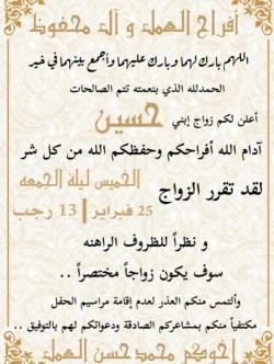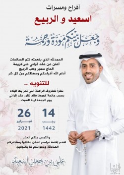 احتفلت عائلة الكوي في تاروت مساء يوم الجمعة بعقد قران الشاب محمد وليد الكوي وسط فرحة الأهل والأصدقاء ومحبي العريسين. أسرة ”جهينة الإخبارية“ تهنئ العريسين وعائلتيهما وتسأل الله ان يبارك لهما، متمنين لهما حياة سعيدة. ‏ ...