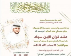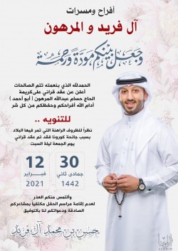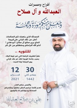 رُزق الشاب موسى العيد نجل المعلم والكاتب جعفر محمد العيد بمولود اتفق وحرمه كريمة الحاج عيسى آل آدم على تسميته «مهدي». أسرة ”جهينة الإخبارية“ تبارك له على المولود جعله الله من مواليد السعادة واقر الله به عين والديه. ... |