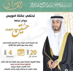 احتفلت عائلة امويس والعبد المحسن في الجش مساء يوم الإثنين بزفاف الشاب حسين حسن امويس على كريمة الحاج عيسى عبد المحسن العبد المحسن وسط فرحة الأهل والأصدقاء ومحبي العريسين. وعبر العريس عن سعادته الغامرة بدخوله القفص الذهبي، سائلا الله أن يوفقه وعروسه ويرزقهما الذرية الصالحة. أسرة ”جهينة الإخبارية“ تهنئ العريسين وعائلتيهما وتسأل الله ان يبارك لهما، متمنين لهما حياة سعيدة. ...