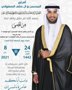 احتفلت عائلة المحسن وآل خلف الصفواني في العوامية مساء يوم الجمعة بزفاف الشاب مرتضى جعفر محمد المحسن على كريمة الحاج محمد محسن آل خلف الصفواني وسط فرحة الأهل والأصدقاء ومحبي العريسين. وعبر العريس عن سعادته الغامرة بدخوله القفص الذهبي، سائلا الله أن يوفقه وعروسه ويرزقهما الذرية الصالحة. أسرة ”جهينة الإخبارية“ تهنئ العريسين وعائلتيهما وتسأل الله ان يبارك لهما، متمنين لهما حياة سعيدة. ...