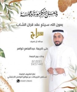 احتفلت عائلة آل نصيف والخواهر في سيهات مساء يوم الجمعة بعقد قران الشاب سراج عبدالله ال نصيف على كريمة الحاج عبد المنعم الخواهر وسط فرحة الأهل والأصدقاء ومحبي العريسين. أسرة ”جهينة الإخبارية“ تهنئ العريسين وعائلتيهما وتسأل الله ان يبارك لهما، متمنين لهما حياة سعيدة. ...