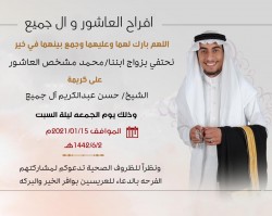 تحتفل عائلة آل محسن وأبو الرحي في تاروت مساء يوم الجمعة بزفاف الشاب حسن محمد حسن آل محسن على كريمة السيد علي السيد عيسى أبو الرحي وسط فرحة الأهل والأصدقاء ومحبي العريسين. وعبر العريس عن سعادته الغامرة بدخوله القفص الذهبي، سائلا الله أن يوفقه وعروسه ويرزقهما الذرية الصالحة. أسرة ”جهينة الإخبارية“ تهنئ العريسين وعائلتيهما وتسأل الله ان يبارك لهما، متمنين لهما حياة سعيدة. ...
