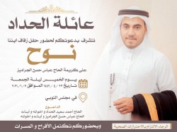 تحتفل عائلة الحداد والجراميز في التوبي مساء يوم الخميس بزفاف الشاب نوح أحمد سعيد الحداد على كريمة الحاج عباس حسن الجراميز في مجلس التوبي وسط فرحة الأهل والأصدقاء ومحبي العريسين. وعبر العريس عن سعادته الغامرة بدخوله القفص الذهبي، سائلا الله أن يوفقه وعروسه ويرزقهما الذرية الصالحة. أسرة ”جهينة الإخبارية“ تهنئ العريسين وعائلتيهما وتسأل الله ان يبارك لهما، متمنين لهما حياة سعيدة. ...