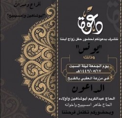 تحتفل عائلة آل نصر في سيهات مساء يوم الأحد بزفاف الشاب قاسم حجي آل نصر على الشابة رحمة حسن الشويخات، والشاب حسن علي آل نصر على الشابة زينب عبد الباقي آل نصر، في مركز الأمير فيصل قاعة اللؤلؤة وسط فرحة الأهل والأصدقاء ومحبي العرسان. أسرة ”جهينة الإخبارية“ تهنئ العرسان وعائلاتهم وتسأل الله ان يبارك لهم، متمنين لهم حياة سعيدة. ...