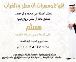 احتفلت عائلة آل مطر والغراب في العوامية مساء يوم السبت بزفاف الشاب مسلم آل مطر على كريمة الحاج رضي عبدالله الغراب وسط فرحة الأهل والأصدقاء ومحبي العريسين. وعبر العريس عن سعادته الغامرة بدخوله القفص الذهبي، سائلا الله أن يوفقه وعروسه ويرزقهما الذرية الصالحة. أسرة ”جهينة الإخبارية“ تهنئ العريسين وعائلتيهما وتسأل الله ان يبارك لهما، متمنين لهما حياة سعيدة. ...
