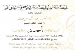 تحتفل عائلة الناصر وآل غزوي في التوبي مساء يوم الخميس بزفاف الشاب أحمد الناصر وسط فرحة الأهل والأصدقاء ومحبي العريسين. اسرة ”جهينة الإخبارية“ تهنئ العريسين وعائلتيهما وتسأل الله ان يبارك لهما، متمنين لهما حياة سعيدة. ...