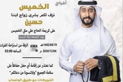 تحتفل عائلة الخميس في القطيف مساء يوم الجمعة بزفاف الشاب حسين الخميس على كريمة الحاج علي مكي الخميس وسط فرحة الأهل والأصدقاء ومحبي العريسين. اسرة ”جهينة الإخبارية“ تهنئ العريسين وعائلتيهما وتسأل الله ان يبارك لهما، متمنين لهما حياة سعيدة. ...