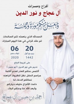احتفلت عائلة آل عجاج في صفوى بعقد قران ابنها أحمد حسن آل عجاج على كريمة الحاج نديم علي نور الدين، وسط فرحة الأهل والأصدقاء ومحبي العريسين، الذين قدموا لهما التهاني والتبريكات. اسرة ”جهينة الإخبارية“ تهنئ العريسين وعائلتيهما وتسأل الله ان يبارك لهما، متمنين لهما حياة سعيدة. ...