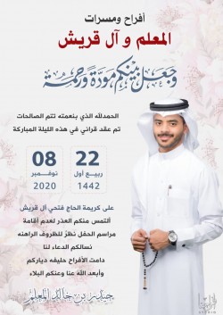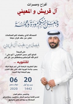احتفلت عائلة آل قريش في صفوى بعقد قران ابنها فيصل نجيب آل قريش على كريمة الحاج أكبر حسن المعيني، وسط فرحة الأهل والأصدقاء ومحبي العريسين، الذين قدموا لهما التهاني والتبريكات. اسرة ”جهينة الإخبارية“ تهنئ العريسين وعائلتيهما وتسأل الله ان يبارك لهما، متمنين لهما حياة سعيدة. ...