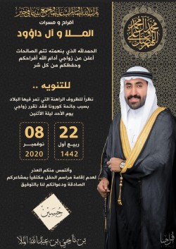 تحتفل عائلة المُلا في مدينة صفوى مساء اليوم الأحد بزفاف ابنها حسين ناجي المُلا. وعبر العريس عن سعادته الغامرة بدخوله القفص الذهبي، ملتمسا العذر عن عدم اقامة حفل زفاف نتيجة ظروف الجائحة القائمة، سائلا الله أن يوفقه وعروسه ويرزقهما الذرية الصالحة. اسرة ”جهينة الإخبارية“ تهنئ العريسين وعائلتيهما وتسأل الله ان يبارك لهما، متمنين لهما حياة سعيدة. ...