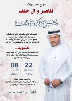 تحتفل عائلة الناصر في مدينة صفوى مساء اليوم الأحد بعقد قران الشاب فيصل فهد الناصر على كريمة الحاج سعيد علي الخلف وسط فرحة الأهل والأصدقاء ومحبي العريسين. اسرة ”جهينة الإخبارية“ تهنئ العريسين وعائلتيهما وتسأل الله ان يبارك لهما، متمنين لهما حياة سعيدة. ...