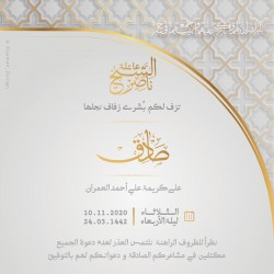 رُزق سلمان محمد صالح البراك بمولودة اتفق وحرمه على تسميتها «فاطمة». أسرة ”جهينة الإخبارية“ تبارك قدوم المولودة جعلها الله من مواليد السعادة واقر الله بها عين والديها. ...