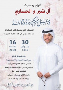 احتفلت عائلة آل شبر والحساوي في صفوى مساء يوم الإثنين بعقد قران الشاب مهدي مرتضى آل شبر على كريمة الحاج علي أحمد الحساوي وسط فرحة الأهل والأصدقاء ومحبي العريسين. اسرة ”جهينة الإخبارية“ تهنئ العريسين وعائلتيهما وتسأل الله ان يبارك لهما، متمنين لهما حياة سعيدة. ...