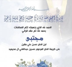 احتفلت عائلة آل مرزوق وآل شياب مساء يوم الإثنين بعقد قران الشاب حسين عبدالله علي آل مرزوق على كريمة الحاج علي مهدي آل شياب وسط فرحة الأهل والأصدقاء ومحبي العريسين. أسرة ”جهينة الإخبارية“ تهنئ العريسين وعائلتيهما وتسأل الله ان يبارك لهما، متمنين لهما حياة سعيدة ... |