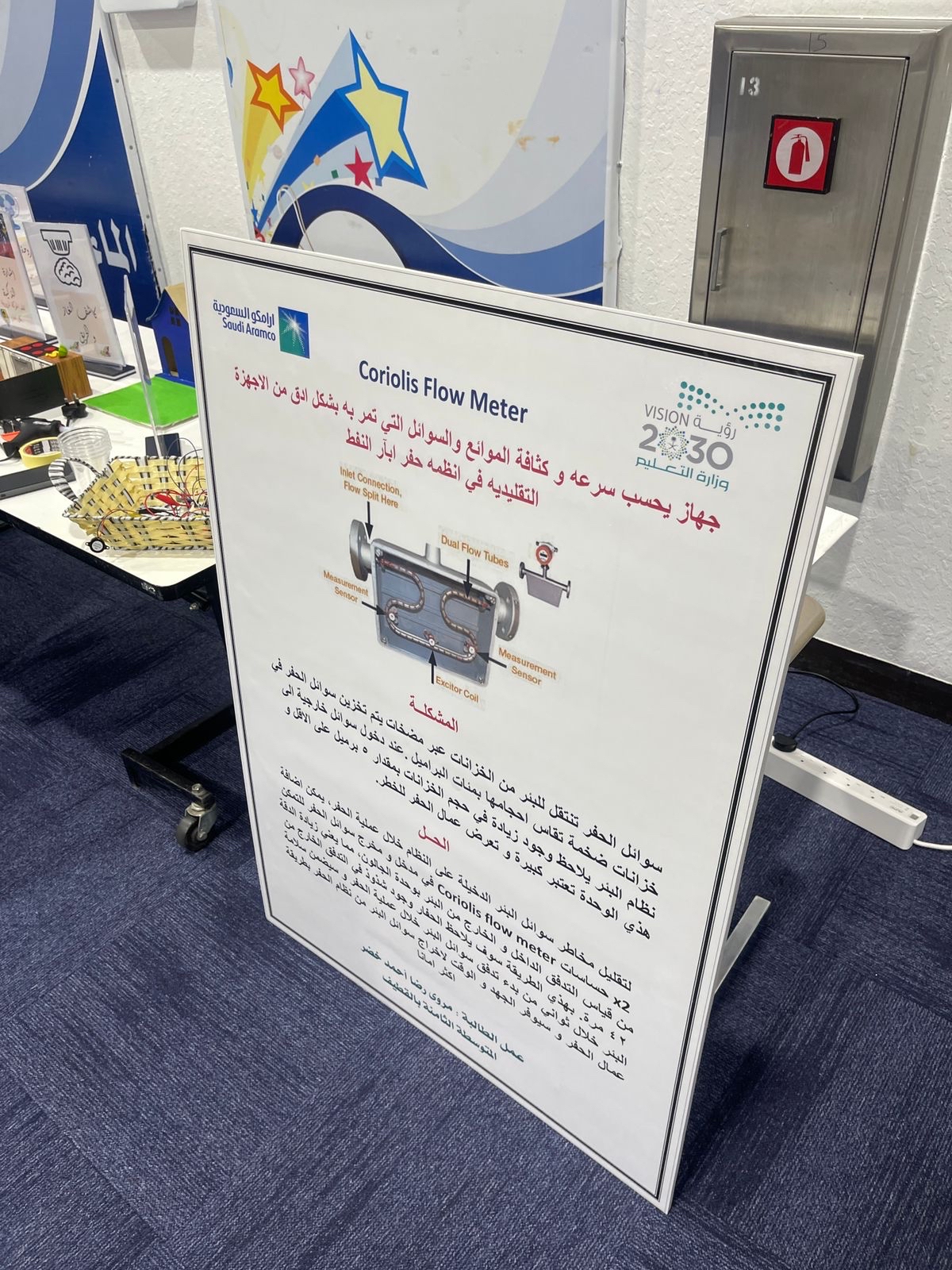 وقدمت الطالبة خضر مشروعًا مبتكرًا، يتضمن جهازًا يستخدم لحساب سرعة وكثافة الموائع والسوائل التي تمر به بشكل أدق من الأجهزة التقليدية في أنظمة حفر آبار النفط.