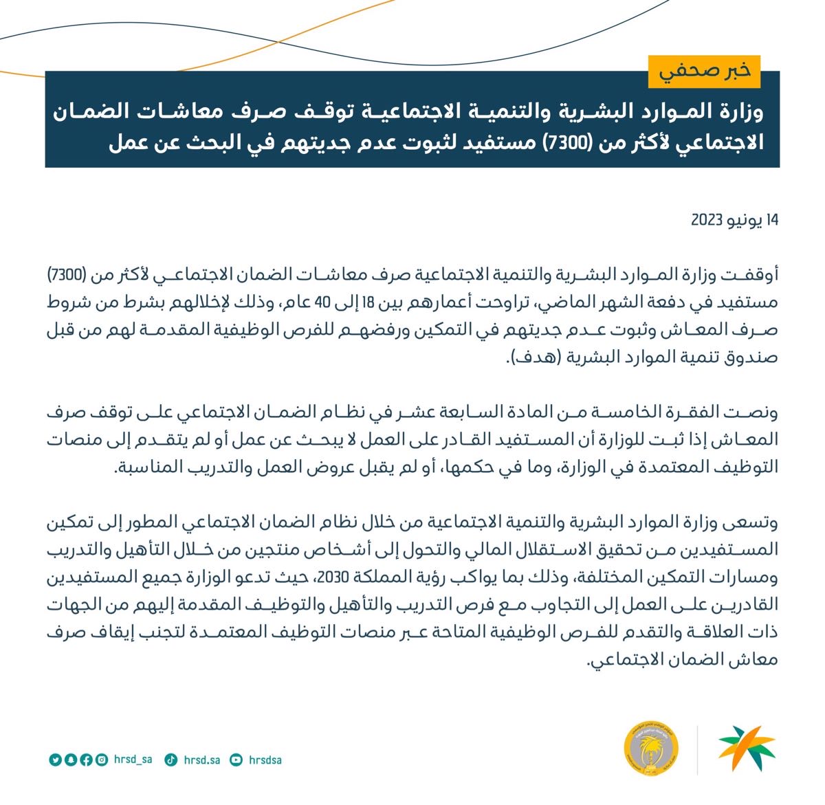 وقالت الوزارة: وذلك لإخلالهم بشرط من شروط صرف المعاشات وثبوت عدم جديتهم في التمكين ورفضهم للفرص الوظيفية المقدمة لهم من قِبَل صندوق تنمية الموارد البشرية.