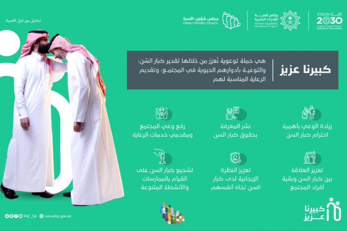 وأكدت الأمين العام لمجلس شؤون الأسرة الدكتورة ميمونة آل خليل أن حملة ”كبيرنا عزيز“ تأتي ضمن الإستراتيجية الوطنية للأسرة، وتهدف إلى تمكين أفراد الأسرة وتعزيز أدوارهم في عملية التنمية المستدامة، وتحقيق رؤية السعودية 2030، وتقديرًا لمكانة كبار السن ودورهم الحيوي في نهضة البلاد.