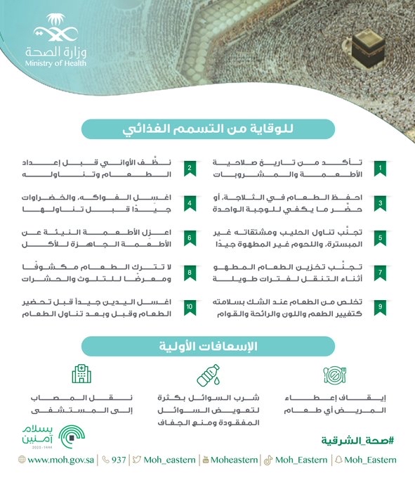 ومن جهة أخرى، حددت وزارة الصحة 3 خطوات للإسعافات الأولية في حال تعرض أحد الحجاج للتسمم الغذائي.
