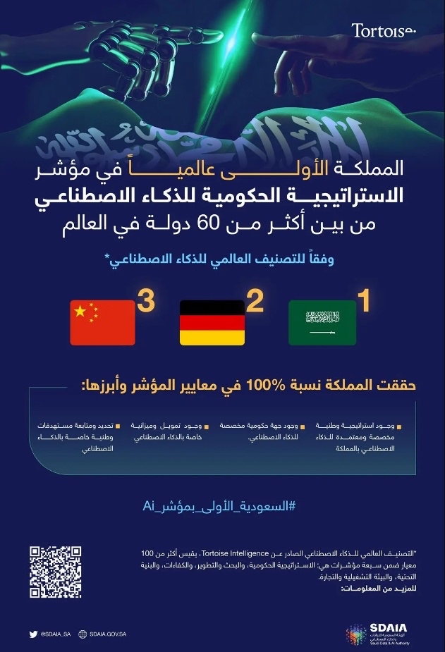 تربعت المملكة على عرش العالم في مؤشر الإستراتيجية الحكومية للذكاء الاصطناعي، والذي يعد أحد مؤشرات التصنيف العالمي في هذا الصدد الصادرة عن تورتويس إنتليجينس ”Tortoise Intelligence“.