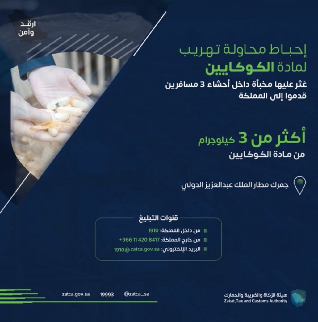 وأوضحت الهيئة أنها عثرت على كمية ”الكوكايين“ مخبأة في أحشاء 3 مسافرين قادمين إلى المملكة؛ وذلك بعد إجراء عملية الكشف والمعاينة داخل المطار.