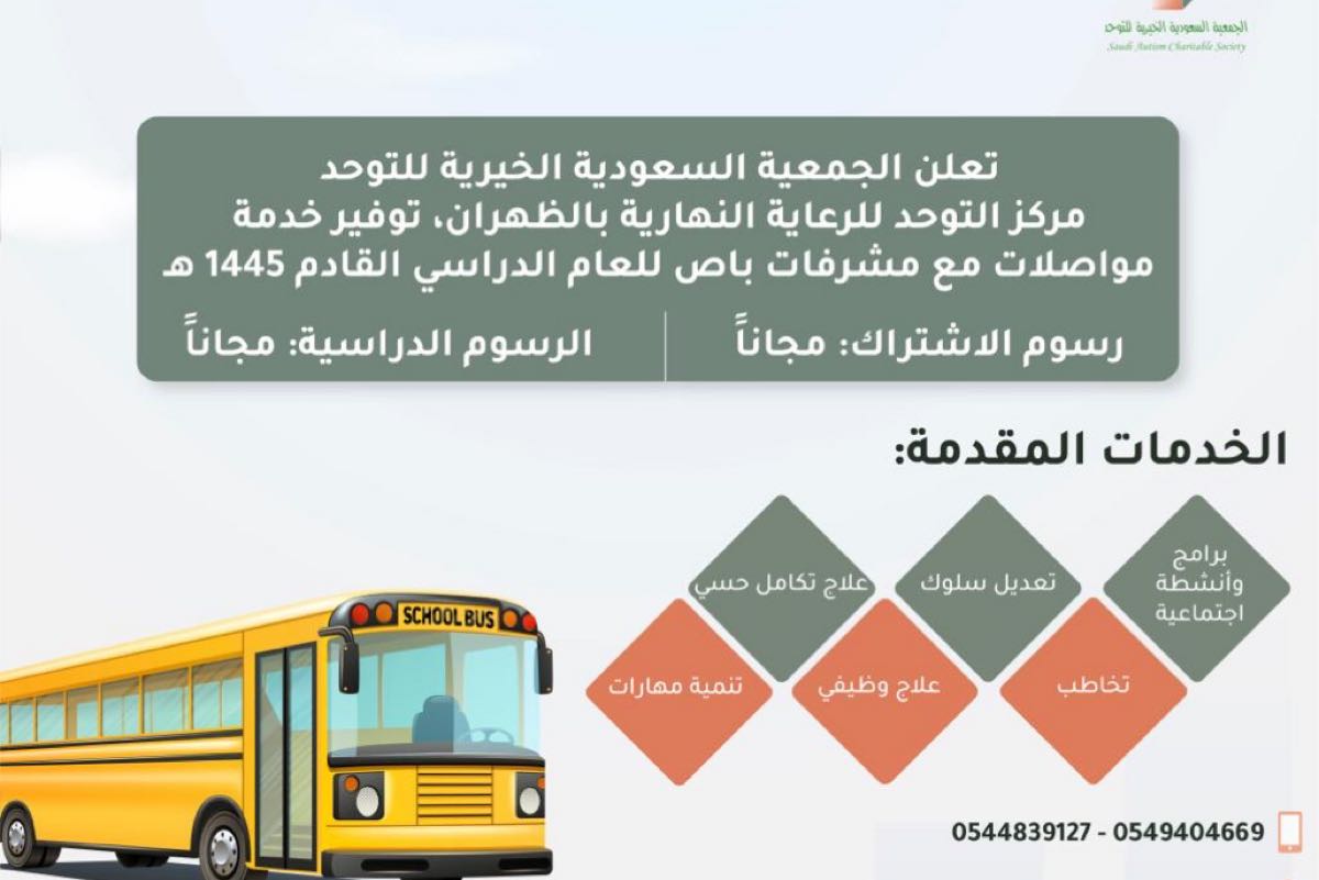 أعلنت الجمعية السعودية الخيرية للتوحد عن توفير خدمة مواصلات للمستفيدين من خدماتها، مع مشرفات باص، للعام الدراسي المقبل 1445 هـ.