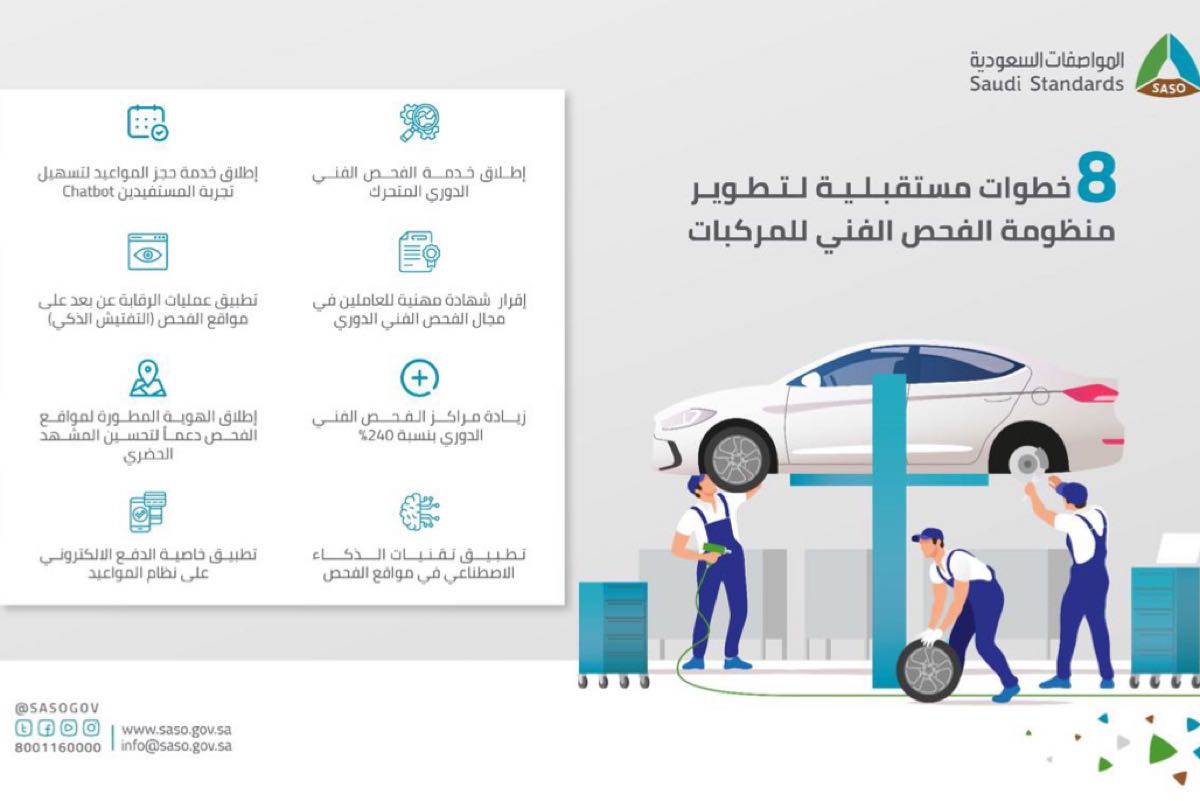 يشار إلى أن الهيئة السعودية للمواصفات والمقاييس والجودة تعمل بالتعاون مع عدد من الجهات الحكومية والخاصة على تنفيذ خطة طموحة لتطوير شامل لمنظومة الفحص الفني الدوري للمركبات بالمملكة.