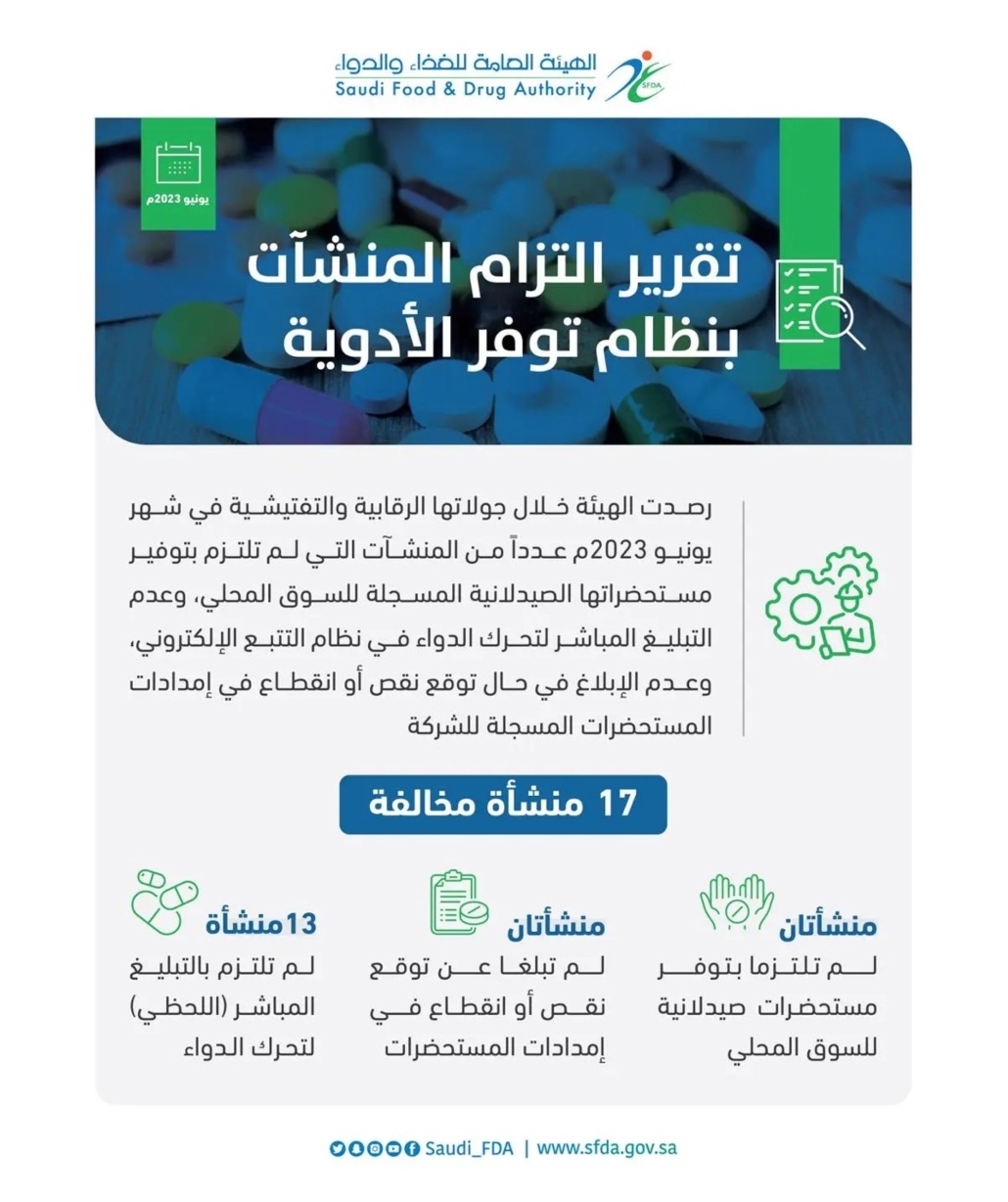 رصدت الهيئة العامة للغذاء والدواء، مخالفات على 17 منشأة صيدلية لعدم التزامها بتوفير المستحضرات الصيدلانية المسجلة للسوق المحلي، وعدم التبليغ في نظام التتبع الإلكتروني، وعدم إبلاغ ”الهيئة“ عن توقع نقص أو انقطاع في إمداد المستحضرات.