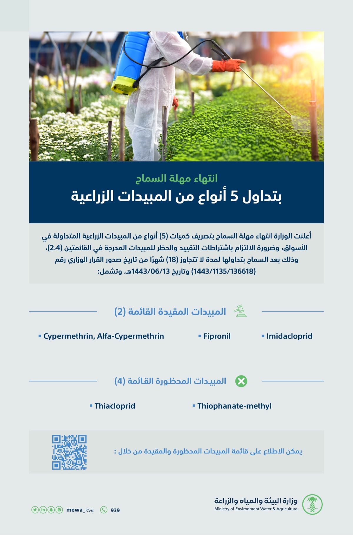 وأوضحت الوزارة أن تلك المبيدات المتداولة بالأسواق مدرجة في القائمتين رقم «2,4»، وفقاً لما جاء بالقرار الوزاري رقم «136618/1135/1443» وتاريخ 13/06/1443ه، والقاضي بالسماح بتداول المبيدات المدرجة بالقائمتين «2,4» لفترة لا تتجاوز «18» شهرًا من تاريخ القرار.