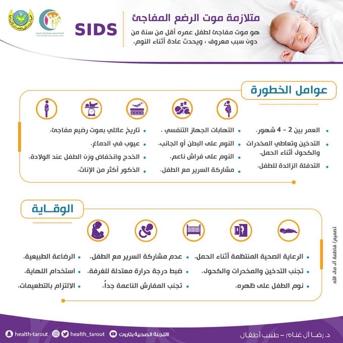 وأوضح في إنفوجراف نشرته اللجنة الصحية بتاروت، أن عوامل الخطورة لمتلازمة موت الرضع المفاجئ تشمل العمر بين 2 - 4 شهور في الذكور أكثر من الإناث، والتهابات الجهاز التنفسي وتاريخ عائلي بموت رضيع مفاجئ، التدخين وتعاطي المخدرات، والنوم على البطن أو الجانب.