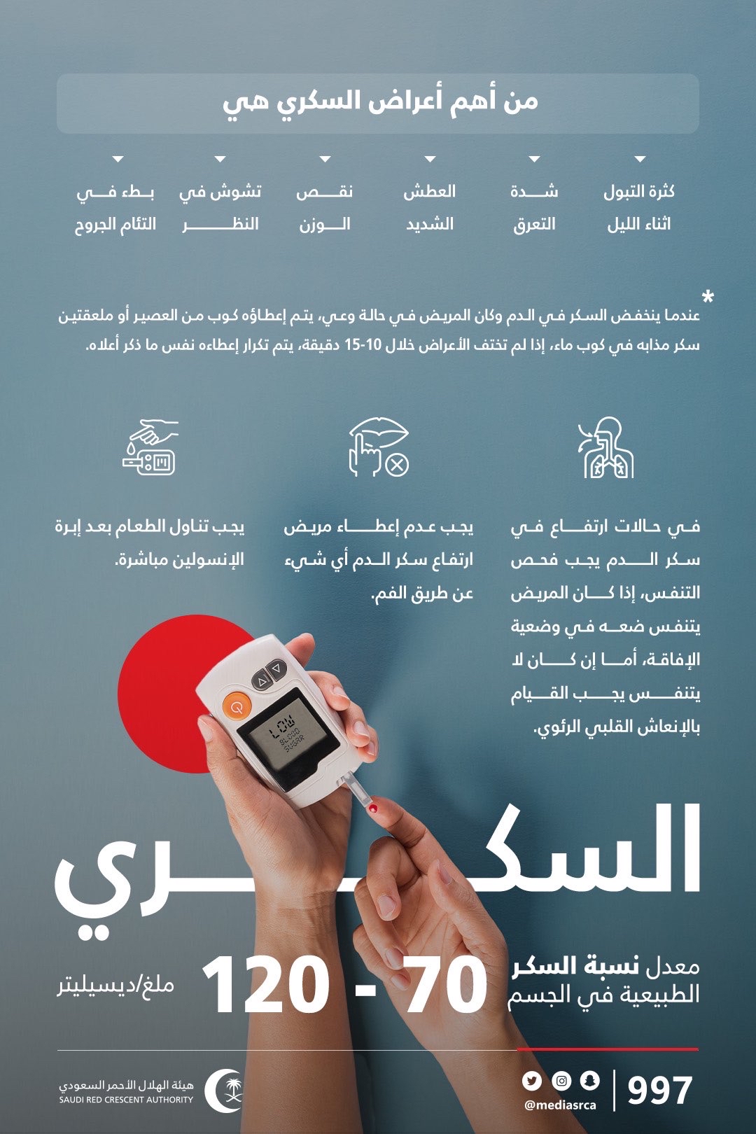 ”الهلال الأحمر“ يكشف كيفية إدارة نسبة السكر في الدم لحماية مرضى السكري