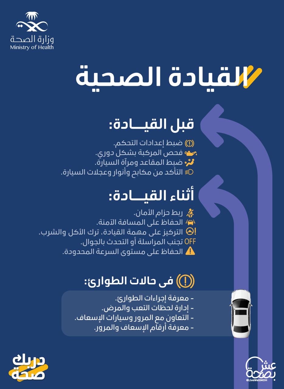 وأكدت الوزارة أن حسابات منصة ”عش بصحة“ تولي اهتمامًا كبيرًا بالجانب الصحي داخل السيارة، نظرًا إلى الأوقات الطويلة التي يمضيها الناس في إنهاء المشاوير اليومية واللازمة، ومن النقاط الهامة في هذه المبادرة عدم ترك العلب المضغوطة والشواحن المتنقلة في السيارة، ووضع كريم واقٍ من الشمس، مع الحرص على طريقة الجلوس الصحيحة وتمارين التمدد لصحة العضلات، واختيار الوجبات والمشروبات الصحية الخالية من السكريات والدهون، وتجنب الوجبات السريعة.