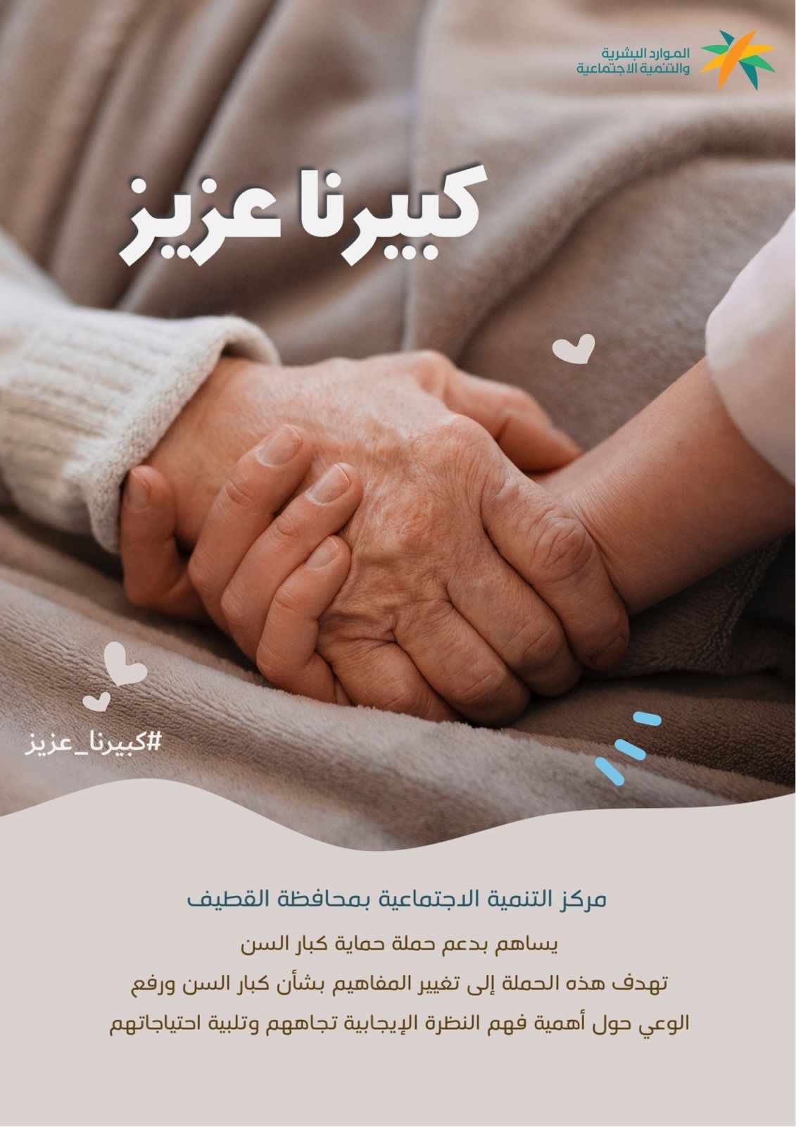 يشارك مركز التنمية الاجتماعية بمحافظة القطيف، في الحملة التوعوية بحقوق كبار السن، التي تُطلقها وزارة الموارد البشرية والتنمية الاجتماعية، اليوم، تحت شعار ”كبيرنا عزيز“.