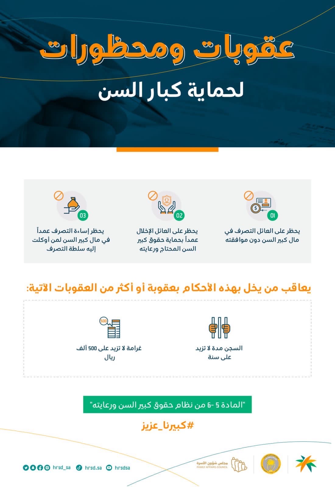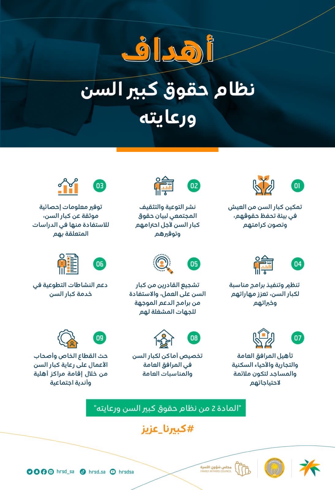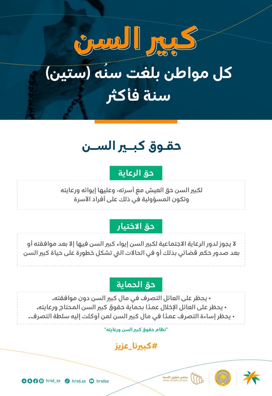 وتسعى الحملة إلى توضيح أهداف نظام حقوق كبير السن، وأولها تمكينهم من العيش في بيئة تحفظ حقوقهم وتصون كرامتهم.