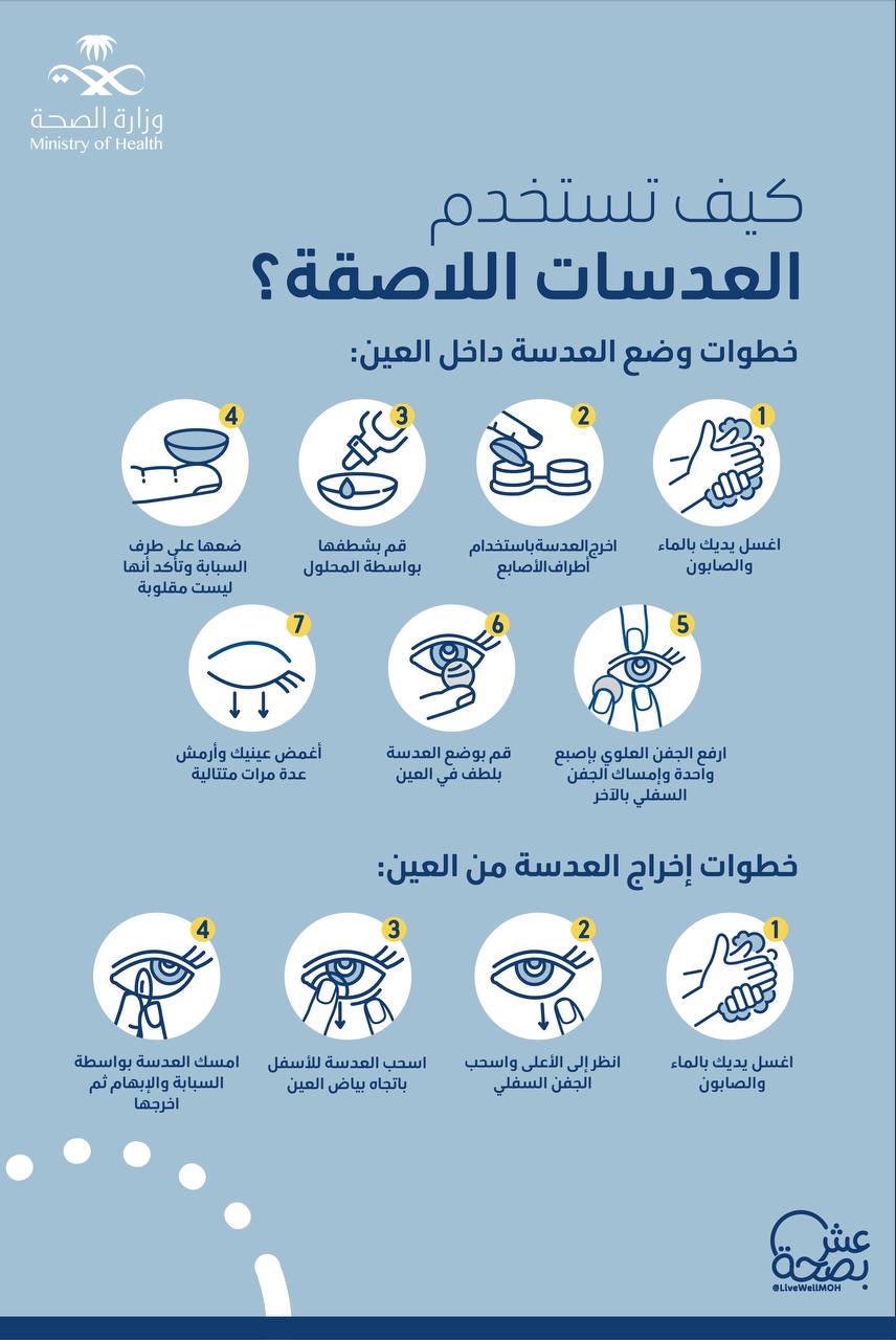 وأشارت الوزارة إلى أنه في حالة رغبة المستخدم في إخراج العدسة، يجب أن يقوم بغسل يديه جيدًا بالماء والصابون أولاً. ثم يتعين عليه النظر إلى الأعلى وسحب الجفن العلوي للكشف عن العدسة، ومن ثم يجب سحب العدسة بلطف نحو الأسفل في اتجاه بياض العين. وأخيرًا، يمكن استخدام السبابة والإبهام لإخراج العدسة من العين.