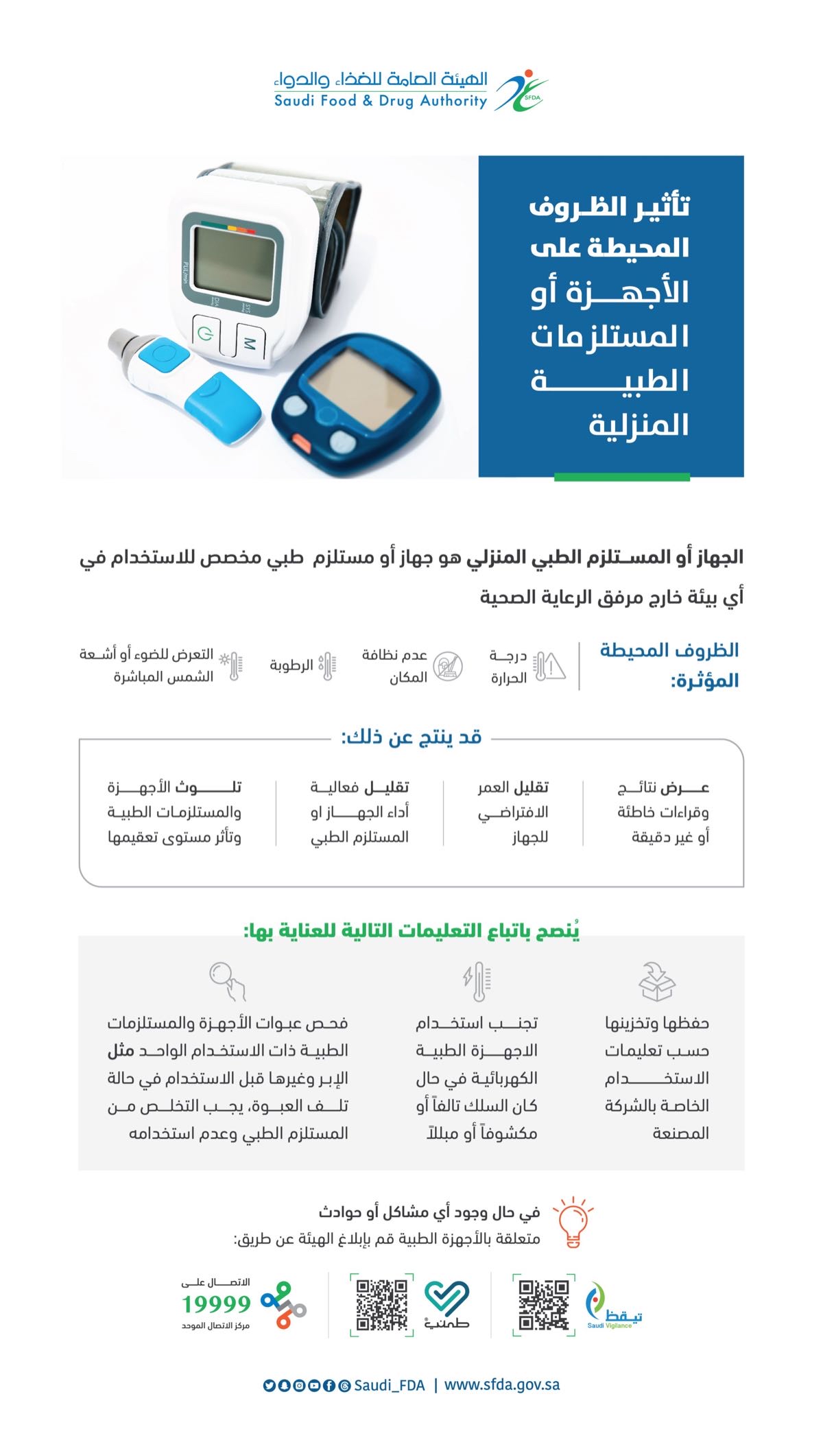 وأهابت الهيئة بالمواطنين في حال وجود أي مشاكل أو حوادث متعلقة بالأجهزة الطبية، إبلاغ الهيئة عن طريق الاتصال على رقم الاتصال الموحد «19999».