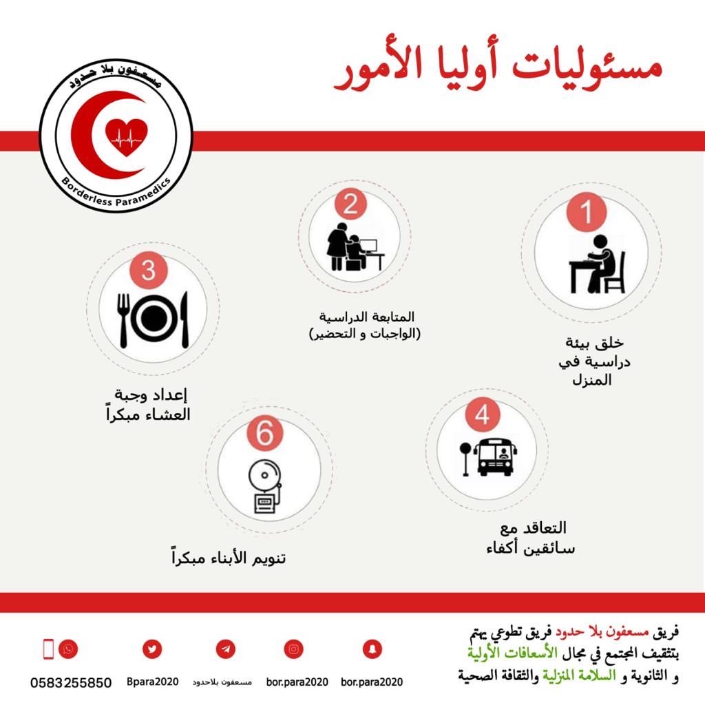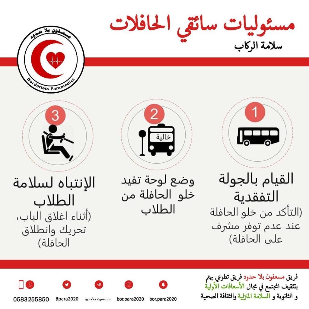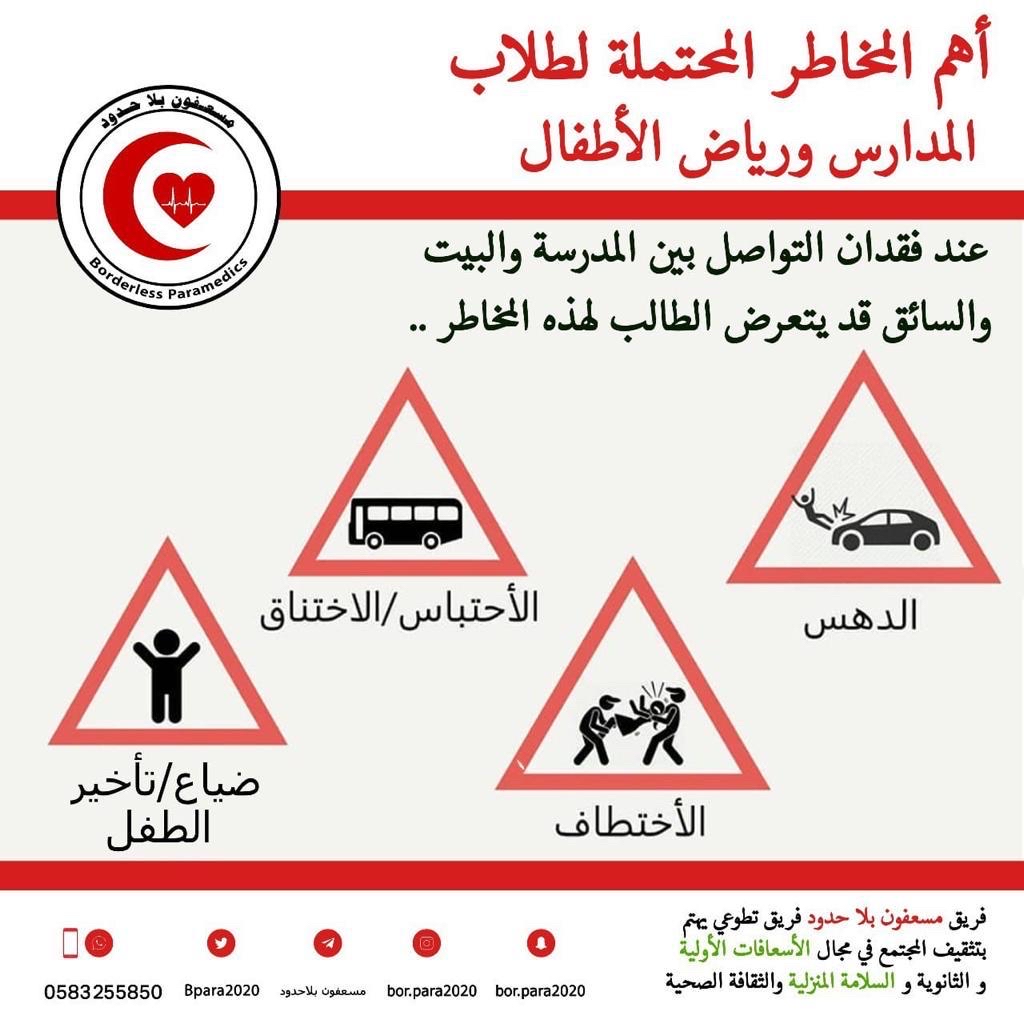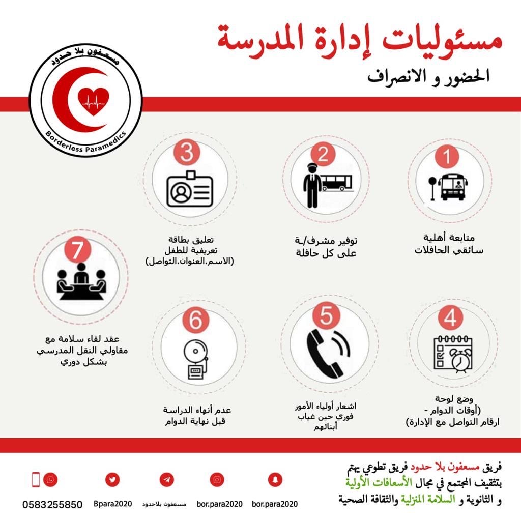 وجّه فريق ”مسعفون بلا حدود“ التطوعي، مجموعة توصيات لسلامة الطلبة والطالبات، لإدارة المدارس، وأولياء الأمور، وسائقي الحافلات، لاستقبال عام دراسي موفق، خال من الكوارث والحوادث المؤسفة.