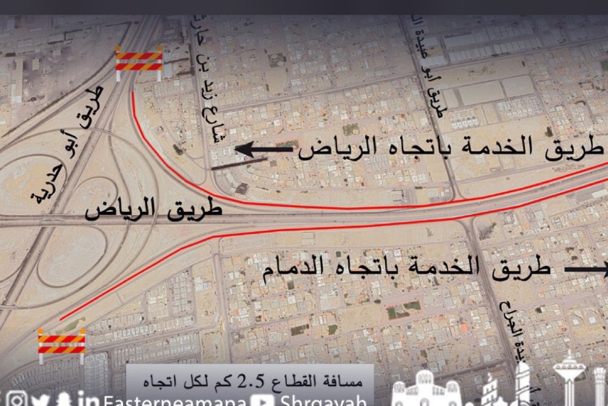 أعلنت أمانة المنطقة الشرقية، بالتعاون مع إدارة مرور الشرقية، عن البدء من يوم الأحد القادم، في أعمال صيانة طريق الملك عبدالله ”الفرعي“ ”طريق الرياض“ بمدينة الدمام.