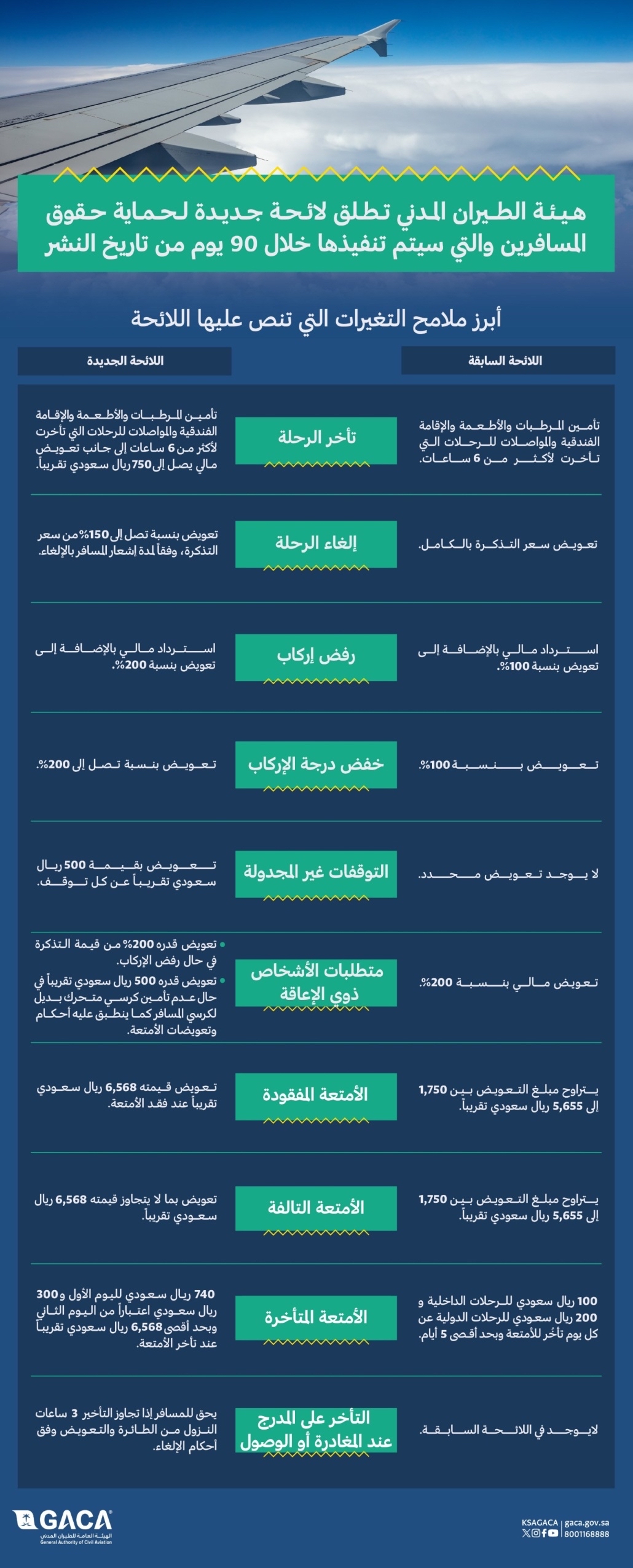 وتسعى الهيئة من خلال اللائحة الجديدة إلى المساهمة في الارتقاء بخدمات النقل الجوي وتعزيز كفاءتها وتحسين تجربة المسافر من وإلى المملكة وداخلها عبر تقديم أدوات الرعاية والمساندة اللازمة.