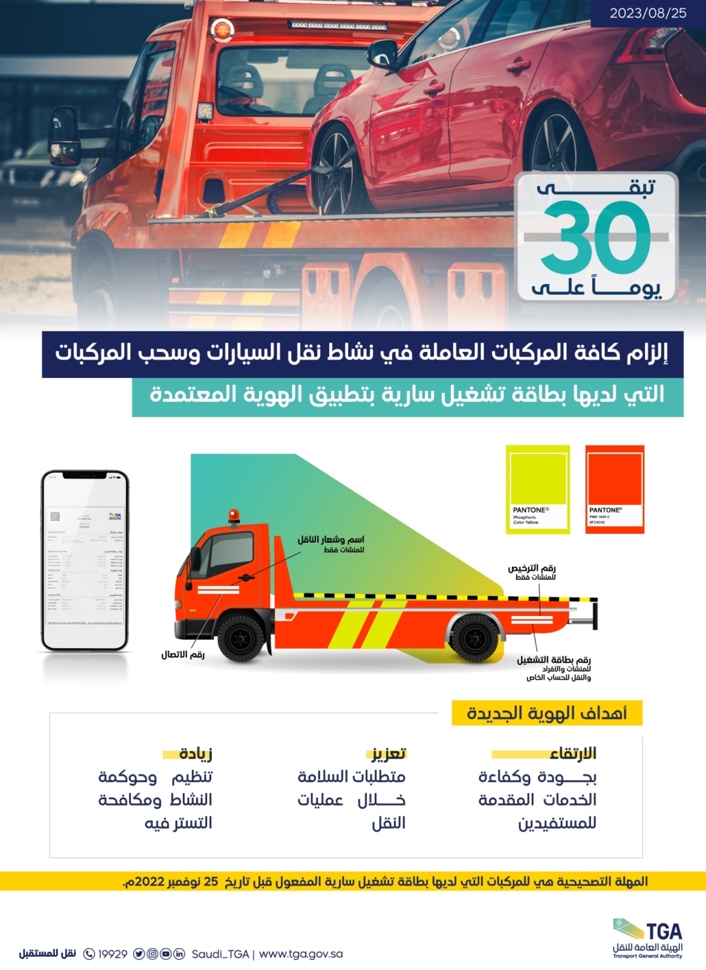 وكانت الهيئة أعلنت تفاصيل هذه الهوية في نوفمبر من العام الماضي 2022، وتتضمن اللون الموحد، والعلامات والبيانات المطلوب وضعها على المركبات التي تعمل في نشاط نقل السيارات وسحب المركبات في المملكة، مع استثناء مدته سنة للحاصلين على بطاقات تشغيل سارية الصلاحية، وقبل تاريخ التطبيق الفعلي للهوية الجديدة.
