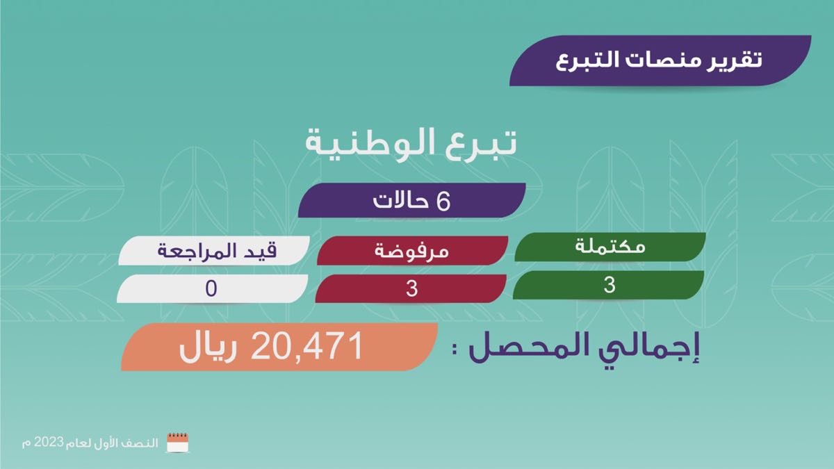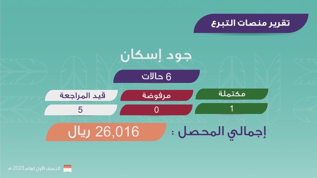 أما في منصة ”تبرع“ الوطنية، بلغ إجمالي المبالغ المحصلة 20,471 ريالا لِ 3 حالات تم قبولها من أصل 6 حالات مقدمة، واكتملت حالة واحدة في منصة جود إسكان بمبلغ 26,016 ريالا، فيما بقيت 5 حالات قيد الدراسة حتى الآن.