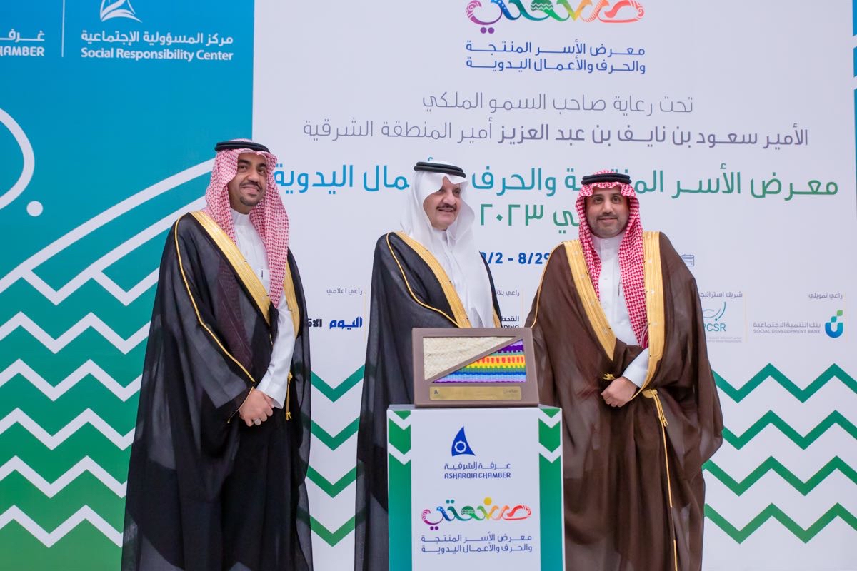وكرَّم أمير الشرقية رعاة «صنعتي 2023 م» والداعمين للمعرض من الجهات الحكومية والخاصة، وتسلّم درعًا تحمل هوية المعرض في نسخته السادسة، مستمعًا خلال جولته إلى شرح من رئيس الغرفة بدر الرزيزاء، حول المعرض وأجنحته وأهدافه الرامية إلى ترسيخ ثقافة العمل الحر بين أوساط الأسر المنتجة وأصحاب الحِرف والأعمال اليدوية.