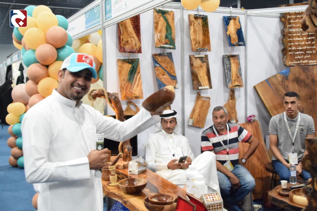 ومن ضمن الأجنحة المتميزة، جناح الحرف والأعمال اليدوية، ويضم نحو 150 ركن يقدم من خلالها أصحاب الحرف والأعمال اليدوية ابداعاتهم الفنية ويقدمون منتجات ذات جودة عالية سواء من ناحية التصميم أو الإخراج، وبرز ركن ”عابث خشب“ الذي يقدم تحفًا فنية من طاولات الطعام والقهوة إلى المباخر والصواني والصحون وحتى الأقلام، مصنوعة جميعها من خشب الأشجار الطبيعية سواء شجر الزيتون أو الصفصاف أو النخيل المحلي ويقول صاحب الركن ”علي عبدالله الشوملي“ إنه يهوى النجارة منذ الصغر ولديه شغف كبير بالأعمال الخشبية، إلا أنه أخذ يفكر في كيفية تقديم أشياء متميزة، فكانت فكرة الاستفادة من أخشاب الأشجار المقطوعة أو تلك التي يتم تجهيزها للحرق بإعادة تدويرها مرة أُخرى وتقديمها في شكل تحف فنية، وأشار إلى أنه بتشجيع الأهل والأصدقاء ومشاركة المتابعين أخذ يمتلك قاعدة عريضة من الزبائن في غالبية مناطق المملكة، معربًا عن أمله في التوسع بشكل أكبر وتكوين شبكة عملاء خارجيين بتصدير أعماله إلى خارج المملكة.